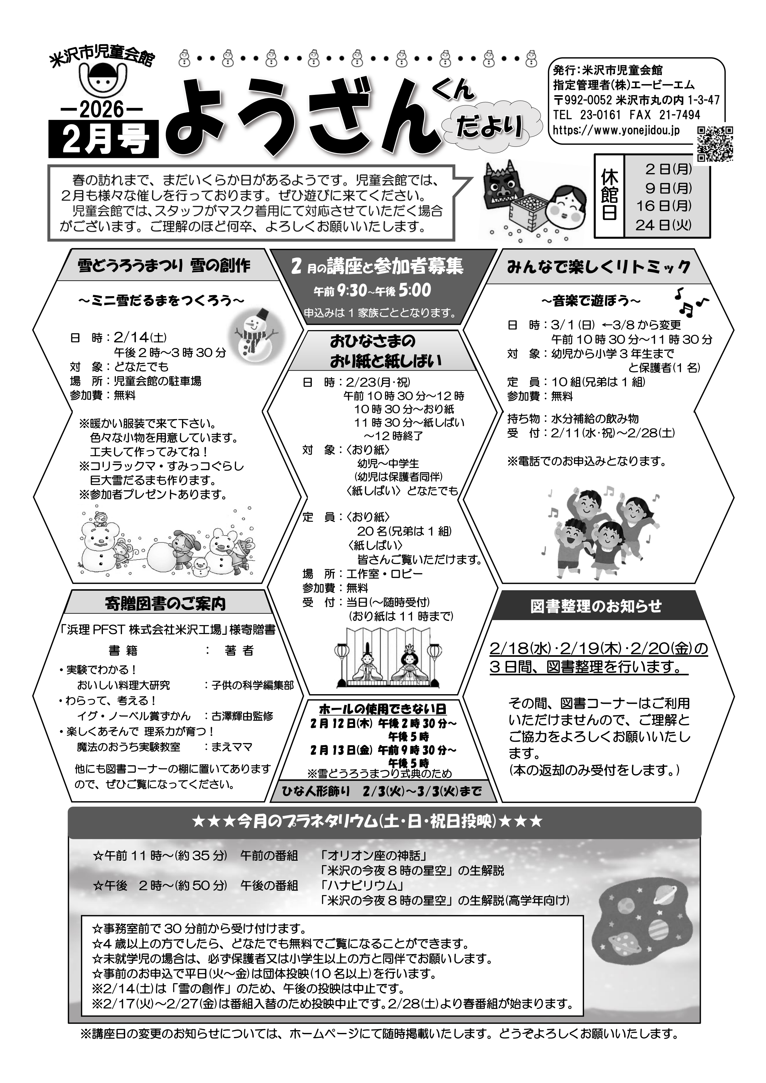 本日はようざんくんだより2月号配布のお知らせと月間予定表公開のお知らせです。